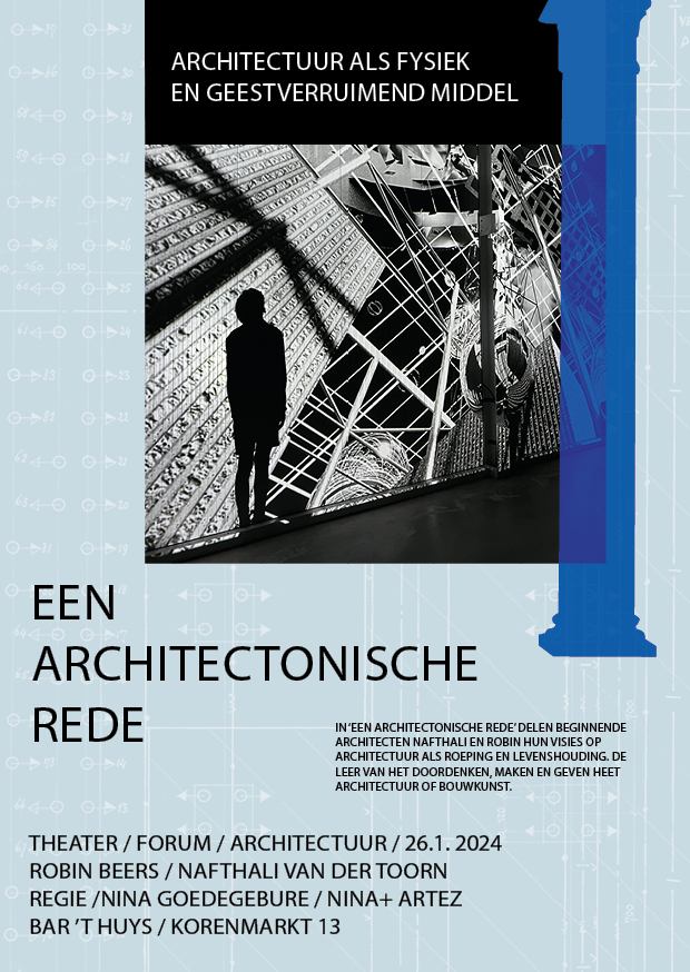 In ‘Een architectonische rede’ delen beginnende architecten Nafthali en Robin hun visies op architectuur als roeping en levenshouding. De leer van het doordenken, maken en geven heet architectuur of bouwkunst.